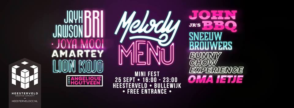 Melody Menu zal plaatsvinden op Heesterveld, dé plek waar creativiteit in alle vormen en maten samen komt. Onze dierbare thuishaven zal worden omgetoverd tot een knus festival terrein. Het event wordt gehost door ‘that fro from the radio’, Angelique Houtveen, bekend van haar programma’s op NPO Radio 6 en FunX.